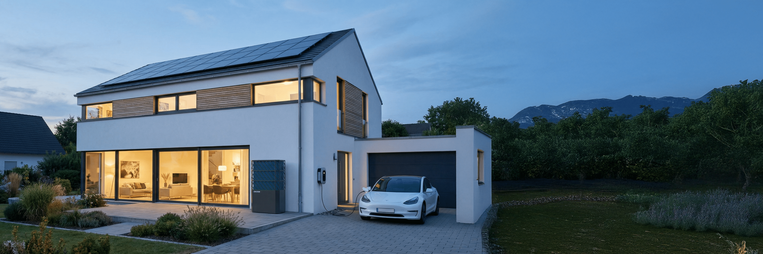 PV erzeugt Strom, Wärmepumpe liefert Wärme, Überschüsse speichert die Batterie.
